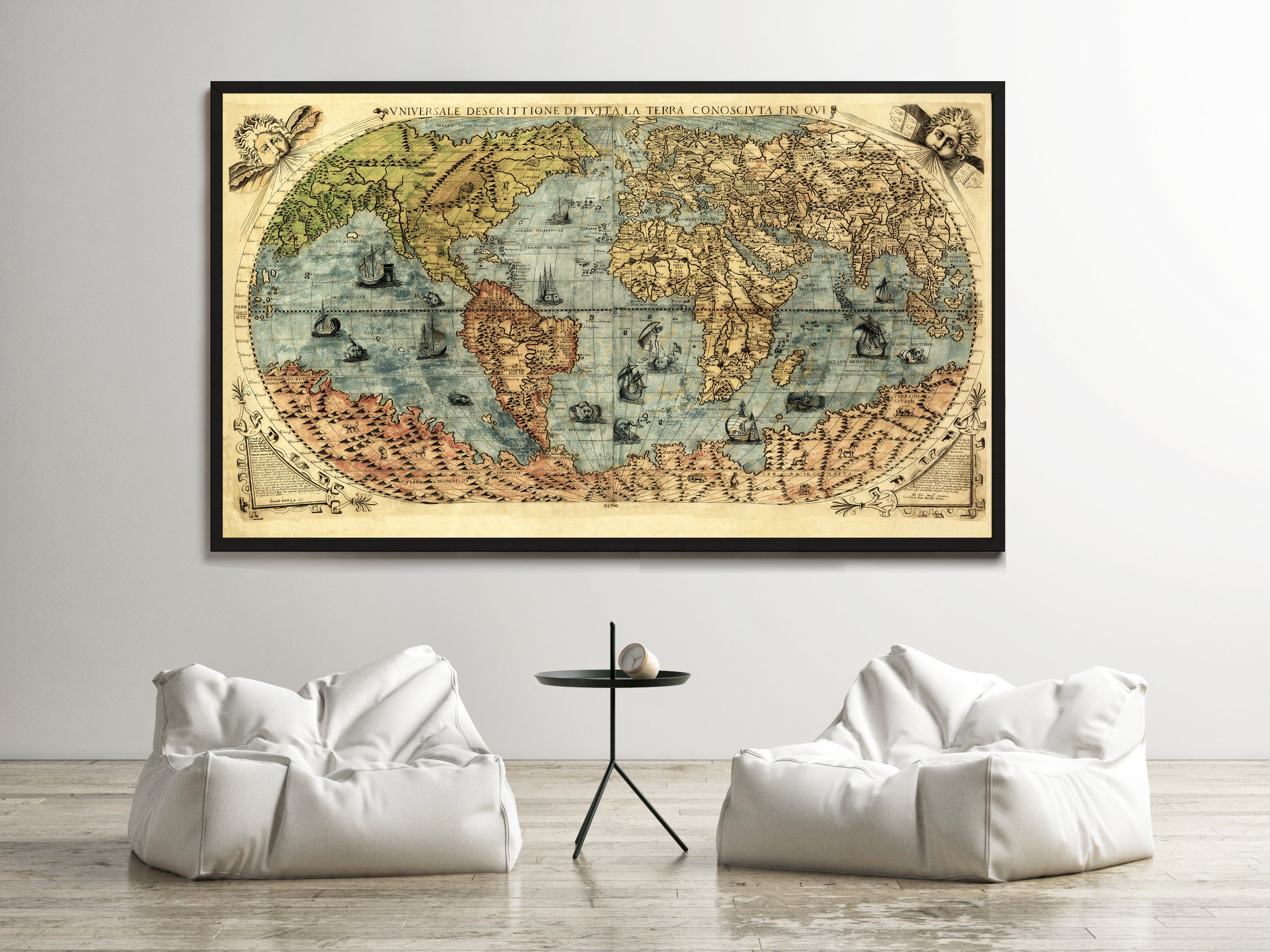This is an original map created in 1565 which shows the known world of the day. This old map gives an incredible view of the New World, recently discovered by Christopher Columbus. The map has a lot of interesting artwork, including pictures of period ships sailing the ocean. The map is titled, "Vniversale descrittione di tvtta la terra conoscivta fin qvi."