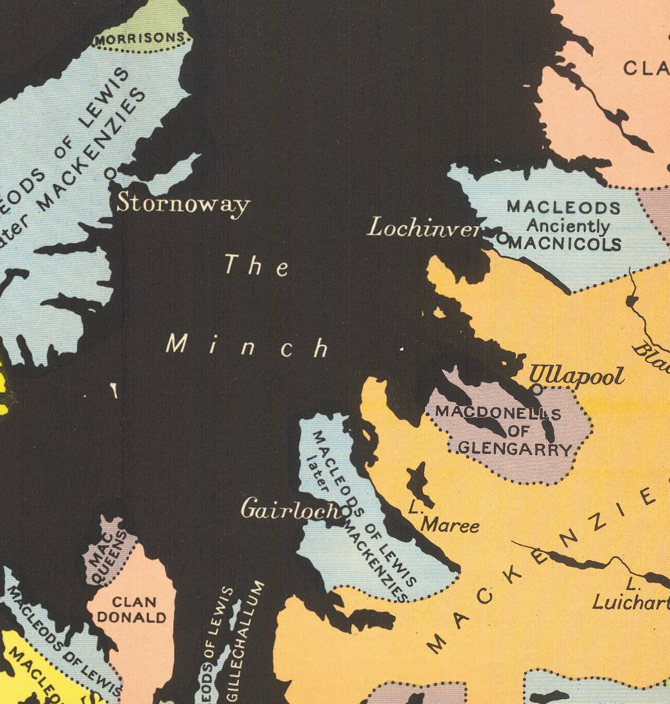 Vintage map of Scotland, showing the historical distribution of clans in the Highlands. The map is color-coded and names multiple clans.